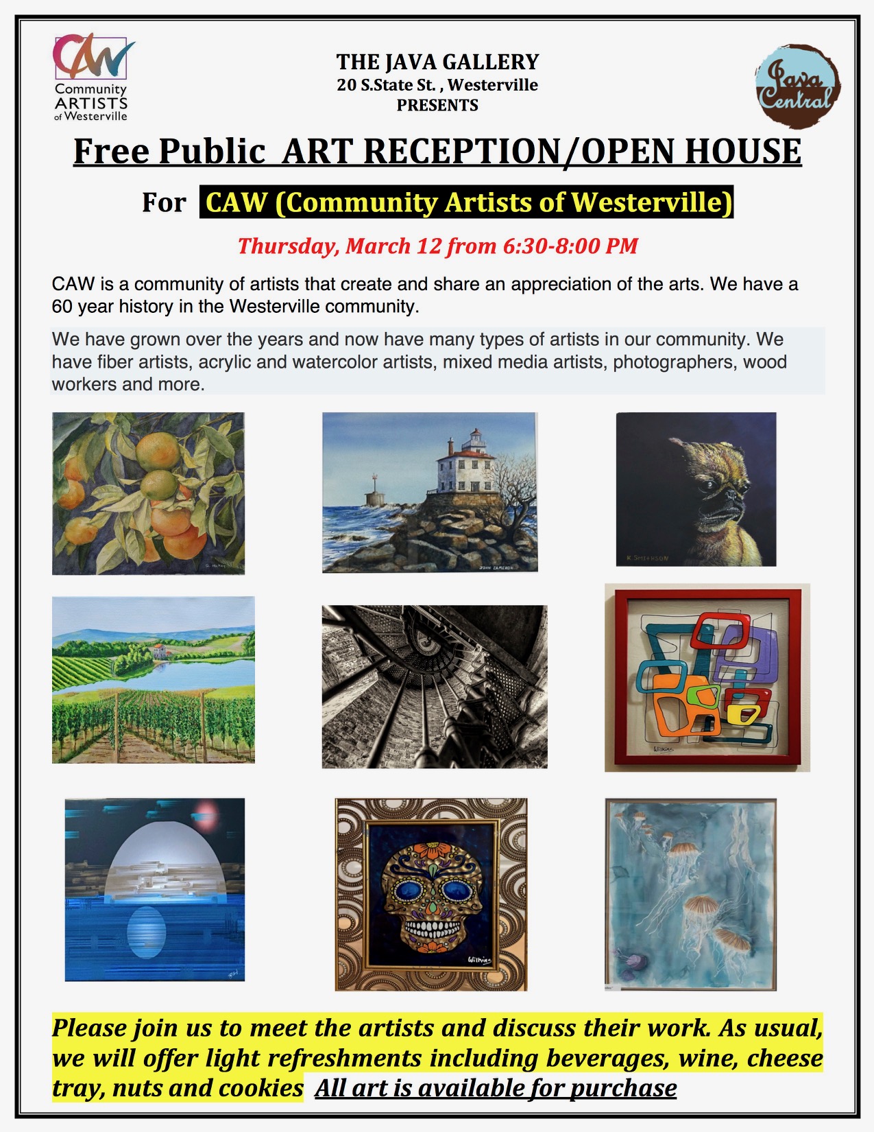 Acoustic One Mic! Every Friday at Java Central from 7pm-10pm. Very eclectic and very good! Welcoming everyone with musical talent and/or aspirations to sing and play – considered one of the best around.