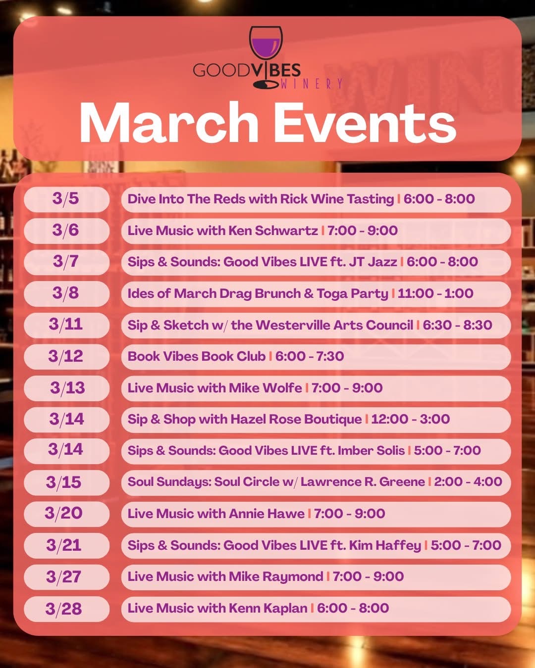 Kick off the weekend with Live Music Fridays at Good Vibes Winery in Uptown Westerville. Each Friday evening, local musicians take the stage to create a relaxed atmosphere perfect for enjoying a glass of wine with friends. Settle in, sip your favorite wine, and enjoy live performances from a rotating … Continue reading →